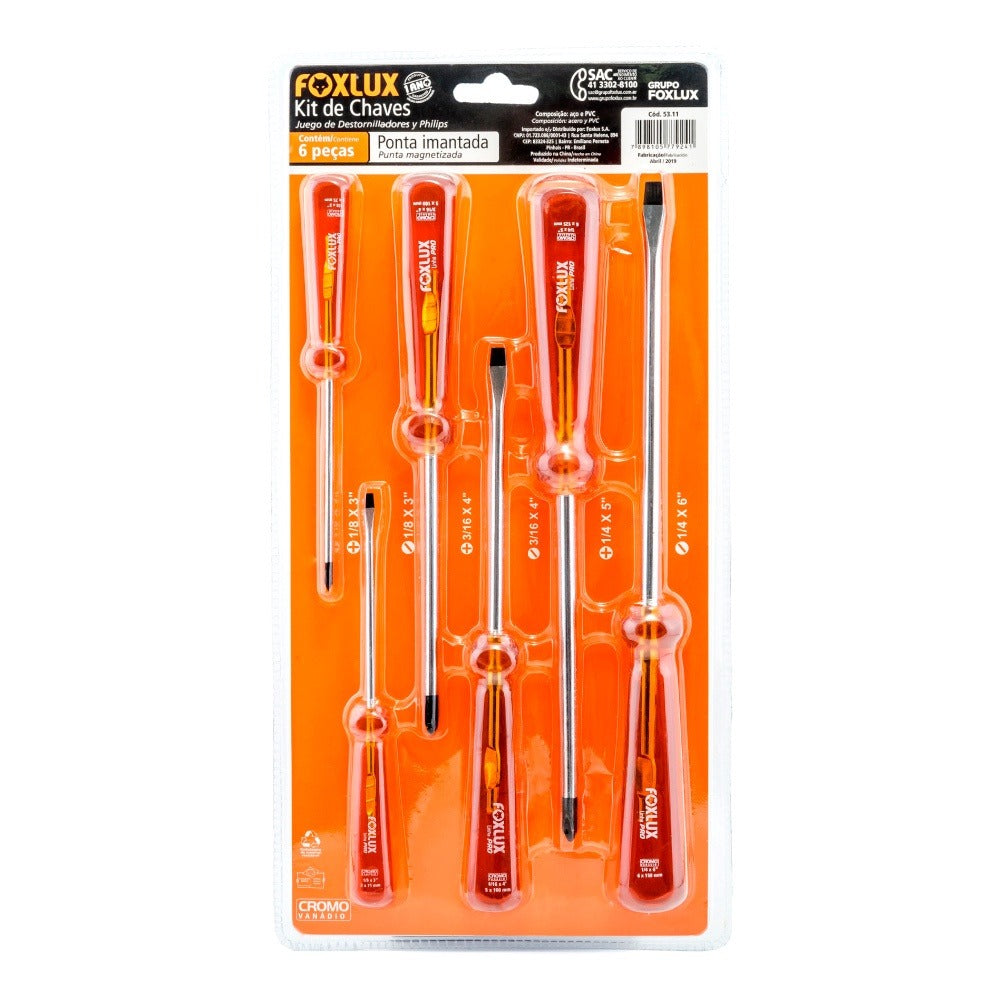 O jogo de chaves de Fenda e chaves Philips da Foxlux tem haste em cromo vanádio e contém 3 chaves de Fenda e 3 chaves Philips com pontas imantadas.